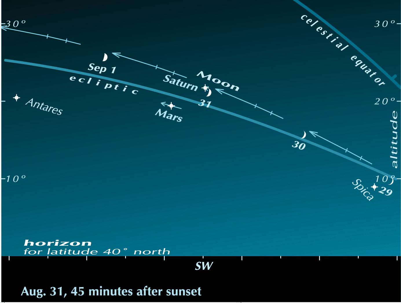 There’s a bright-planet conjunction that you can see from about Sunday Aug. 24 onward and that’s easier than the Aug. 18 Venus-Jupiter one, because it’s in the evening sky. Mars and Saturn are 75 degrees east (leftward) from the Sun. You just need to go out three-quarters of an hour or so after sunset and start looking at the low fading sky left of where the Sun disappeared.
