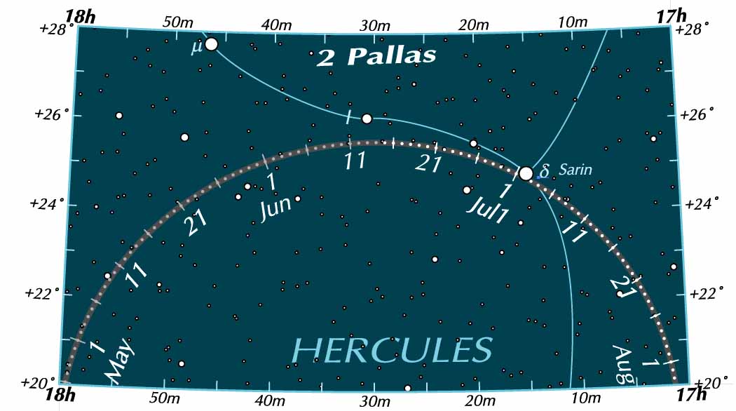 And over in the evening direction, asteroid 2 Pallas is at opposition.