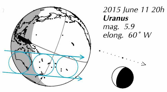 You can see that it is aiming to hit Uranus. In fact it will pass close enough to occult (hide) that distant and dim planet. The same happens every month this year, because of the way the Moon’s orbit is lying. But on this occasion, since it happens half a day from now, it will be the Pacific side of Earth that is turned toward the Moon; also, the Moon’s center is aiming slightly south of Uranus; the result is that the region where the occultation will be observable is Australia.