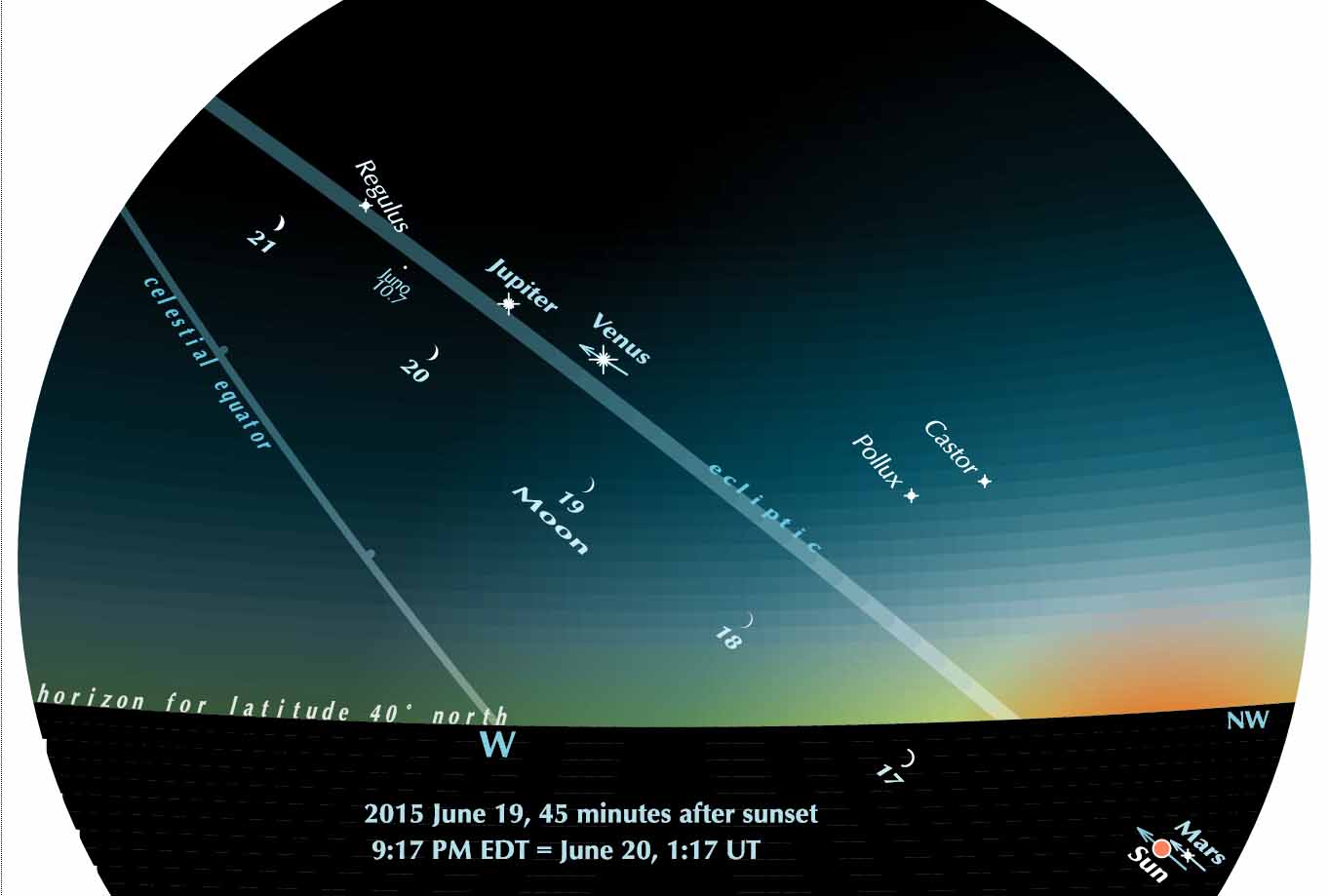The Moon comes climbing from the sunset, and on Saturday June 20 it will pass south of Venus and, a bit more than 12 hours later, Jupiter. These events are closer together in time than those of May 21 and 24, the planets having moved closer to each other; they are also closer approaches, especially the Moon-Venus one. However, Jupiter is now only 51 degrees from the Sun, as against 73 in May, so the Moon when passing it is slimmer. The appulse (closest approach) to Venus is at about 8 Universal Time, so the nearest American sunset to it is the one of Friday June 19. The passage by Jupiter, about a degree closer, is at about 21 UT.