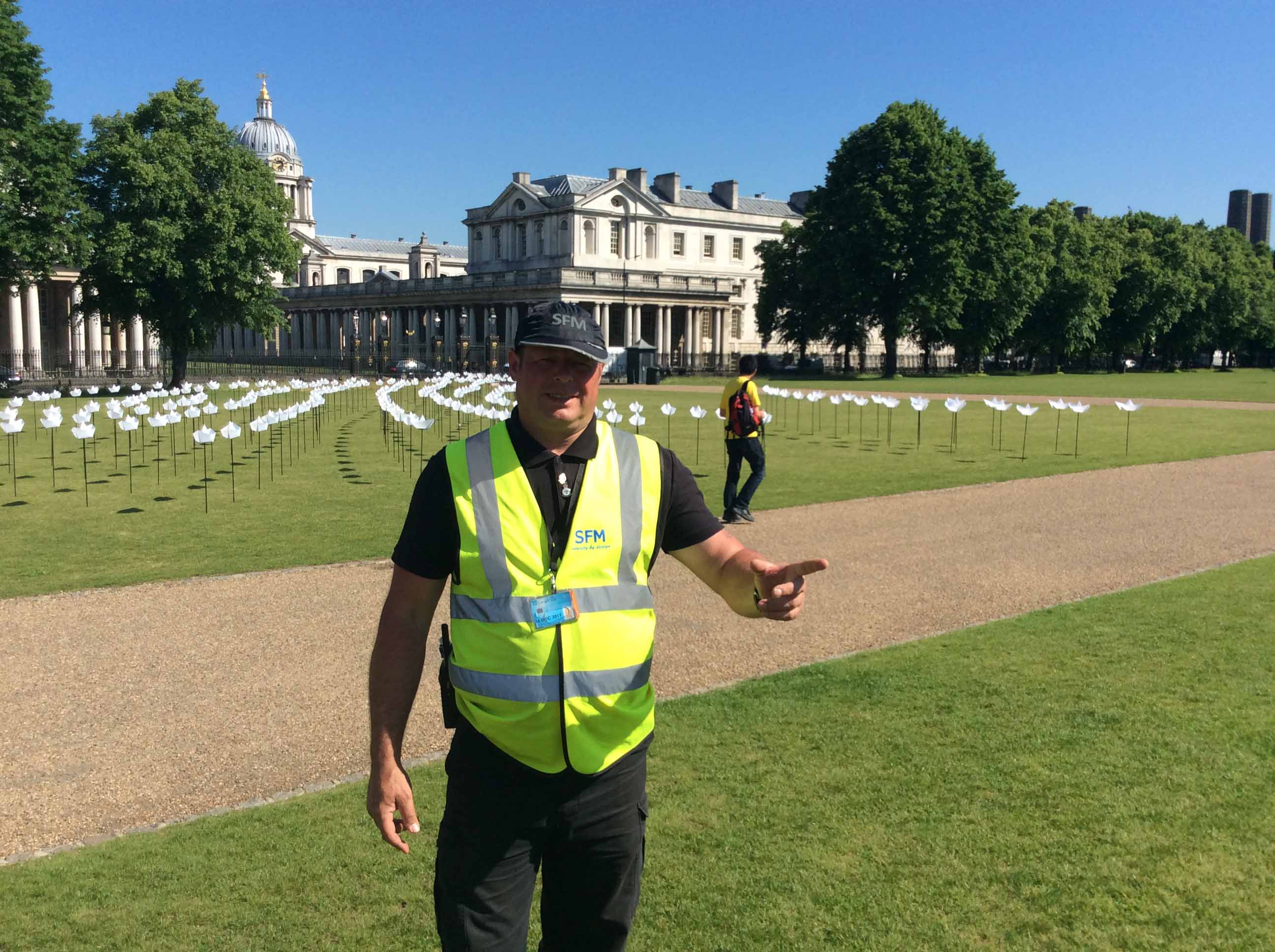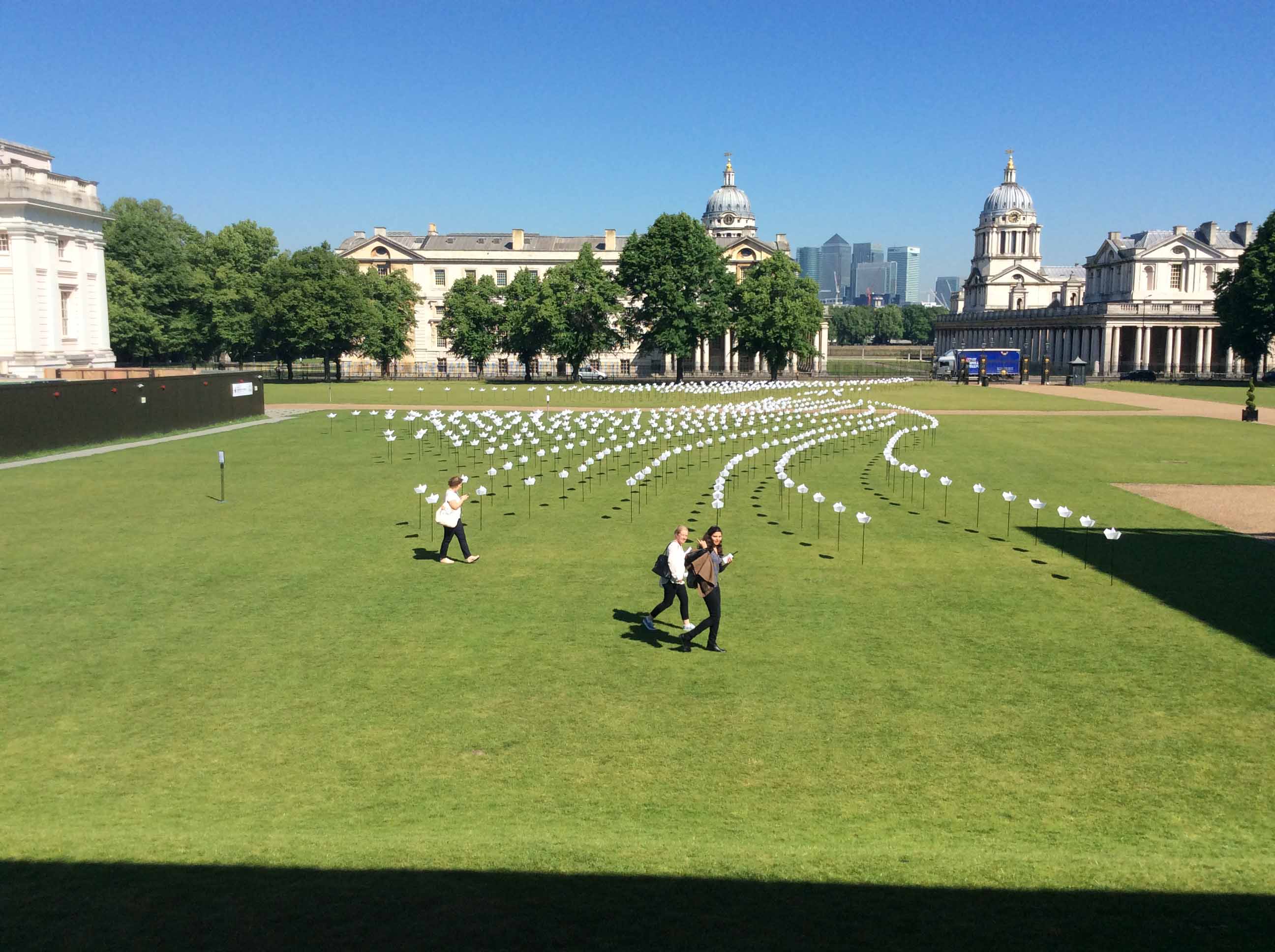 I happened to try a new route for my early-morning bike ride, hoping to find a way around traffic by crossing the lawns in front of the National Maritime Museum. Ahead I beheld a field of white lilies, or perhaps a flock of flamingos.