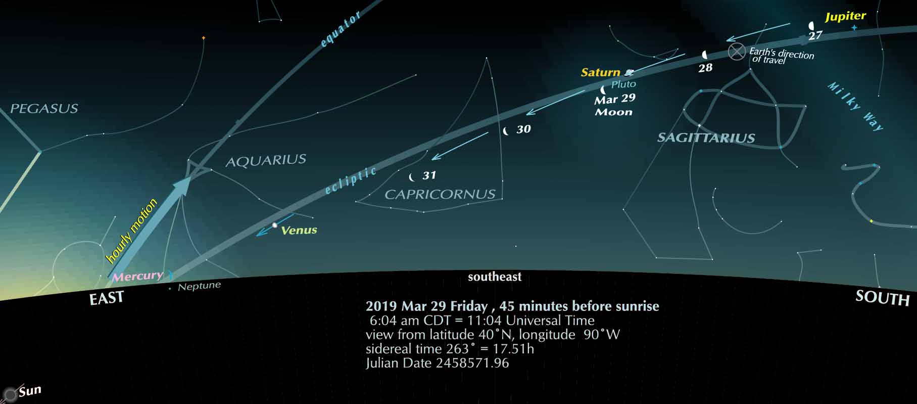 Lined up to the east of the Sun are Mercury and Venus, down close to the horizon, and Saturn and Jupiter quite high. The waning Moon is sliding down past them.