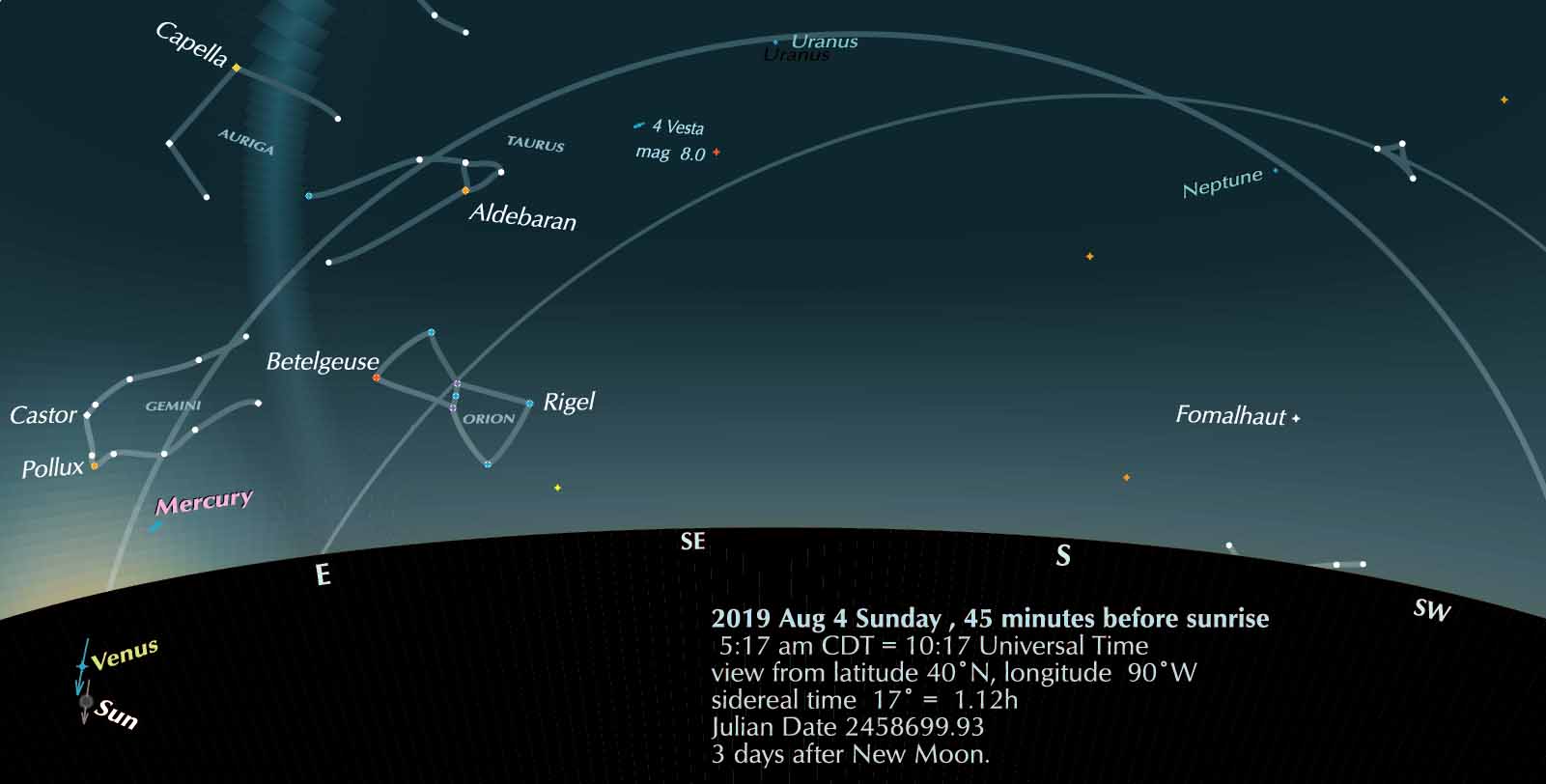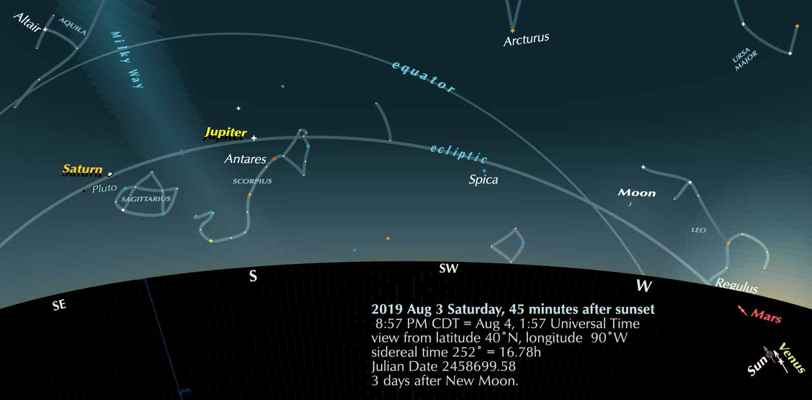 The Moon was New early on August 1, so it appears in the evening scene; its age (at this mid-American location) is 71 hours.