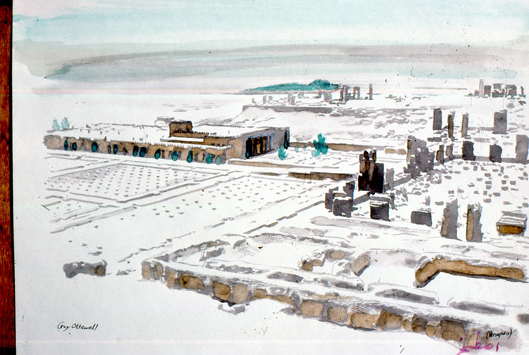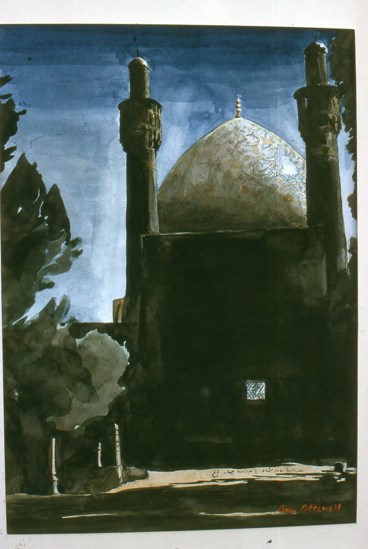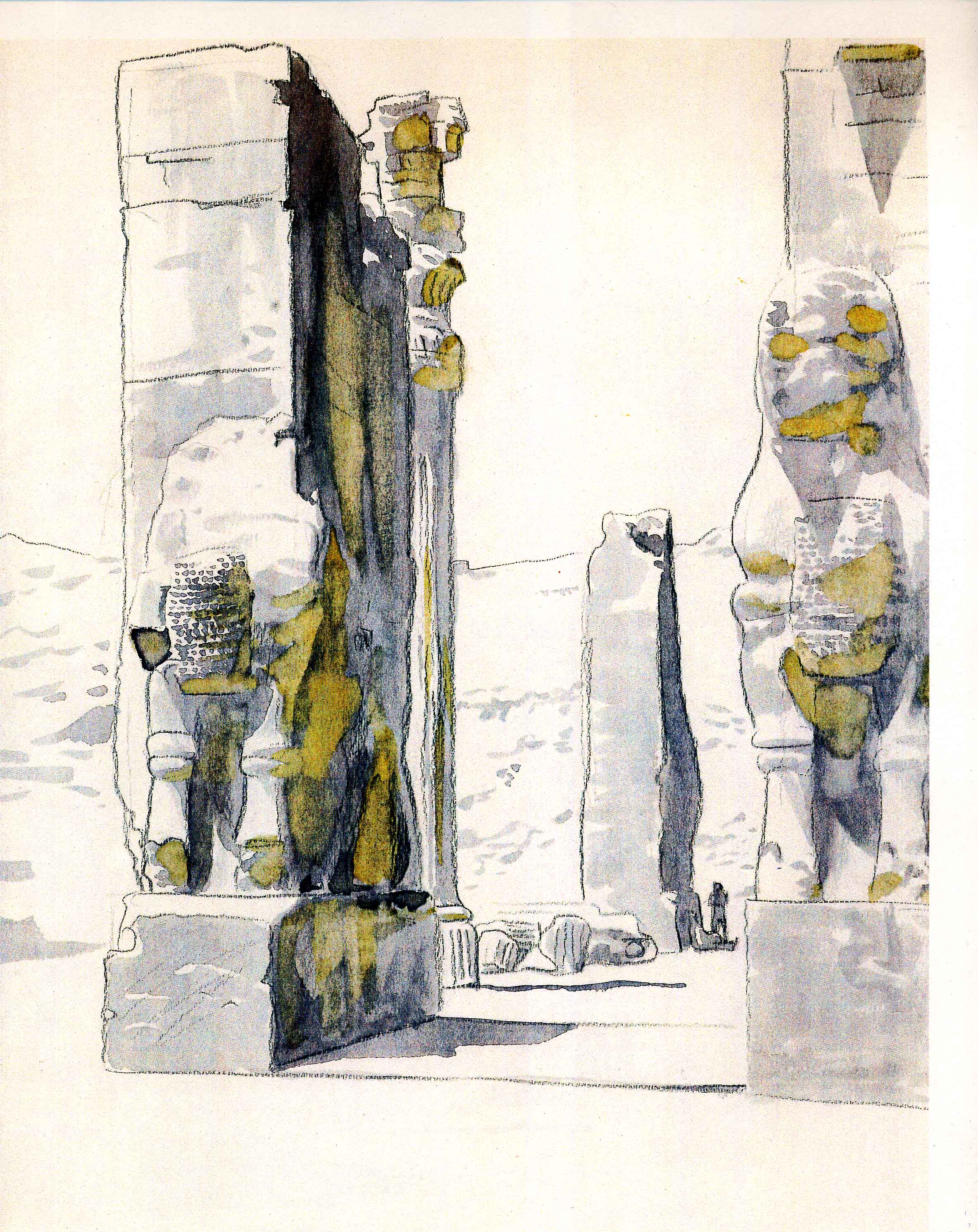 These images are of poor quality, I’m afraid, because they were slides taken of my paintings before I parted with them. They show the ancient capital Persepolis and the Madrasee-ye Chahar Bagh or college of the four gardens, one of the blue-domed monuments of Isfahan.