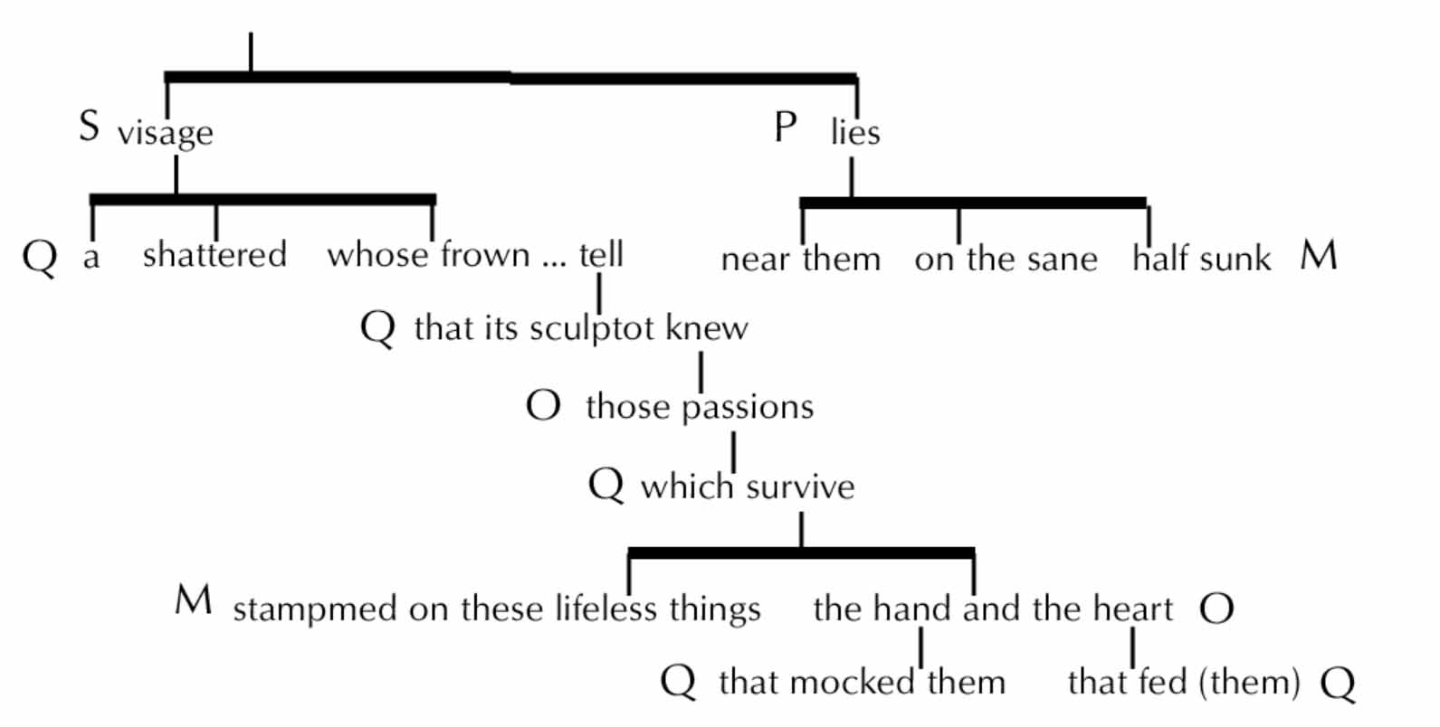 This object consists of five sentences: “Two vast and trunkless legs…”, “Near them on the sand…”, “And on the pedestal…”, “Nothing beside remains”, and “Round the decay…”