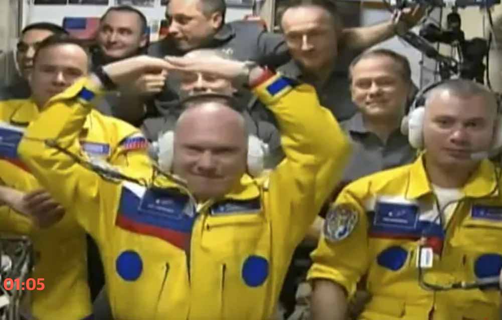 Russia’s cosmonauts wore the yellow and blue colors of the Ukrainian flag as they boarded the International Space Station on March 19. Officials hastened to deny that this signified anything.