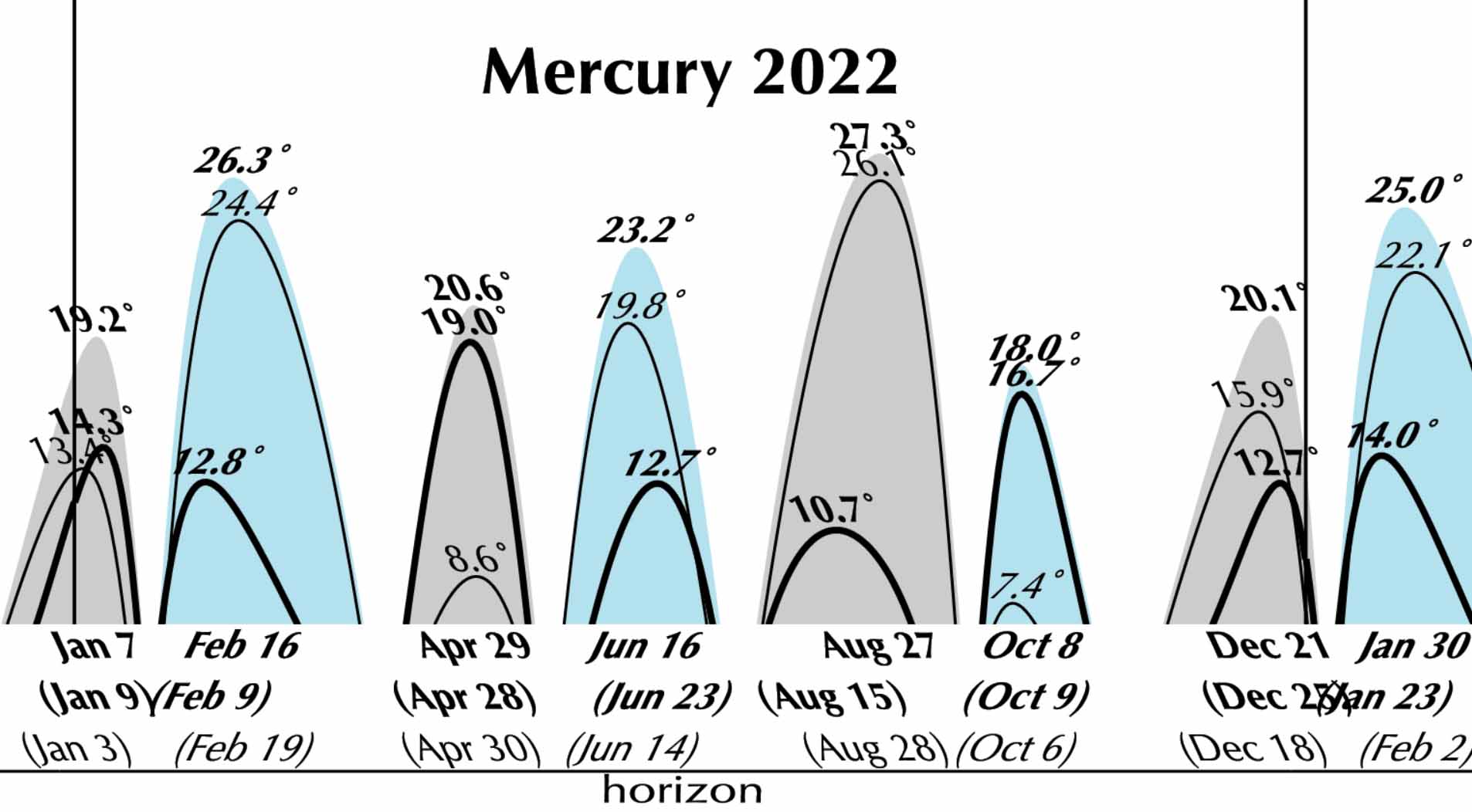 Mercury is shining at magnitude 0.3, like some of the brightest stars, but, unfortunately for us on Earth’s northern hemisphere, it happens to be well south of the ecliptic. So it is, at the time and place of our picture, only about a degree above the horizon. As shown in this comparative graph of Mercury elongation maxima, from page 104 of our Astronomical Calendar 2022,