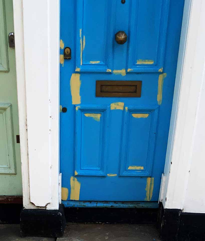Not really. Peter, our Polish painter, has prepped the door for repainting by touching some spots with wood filler.