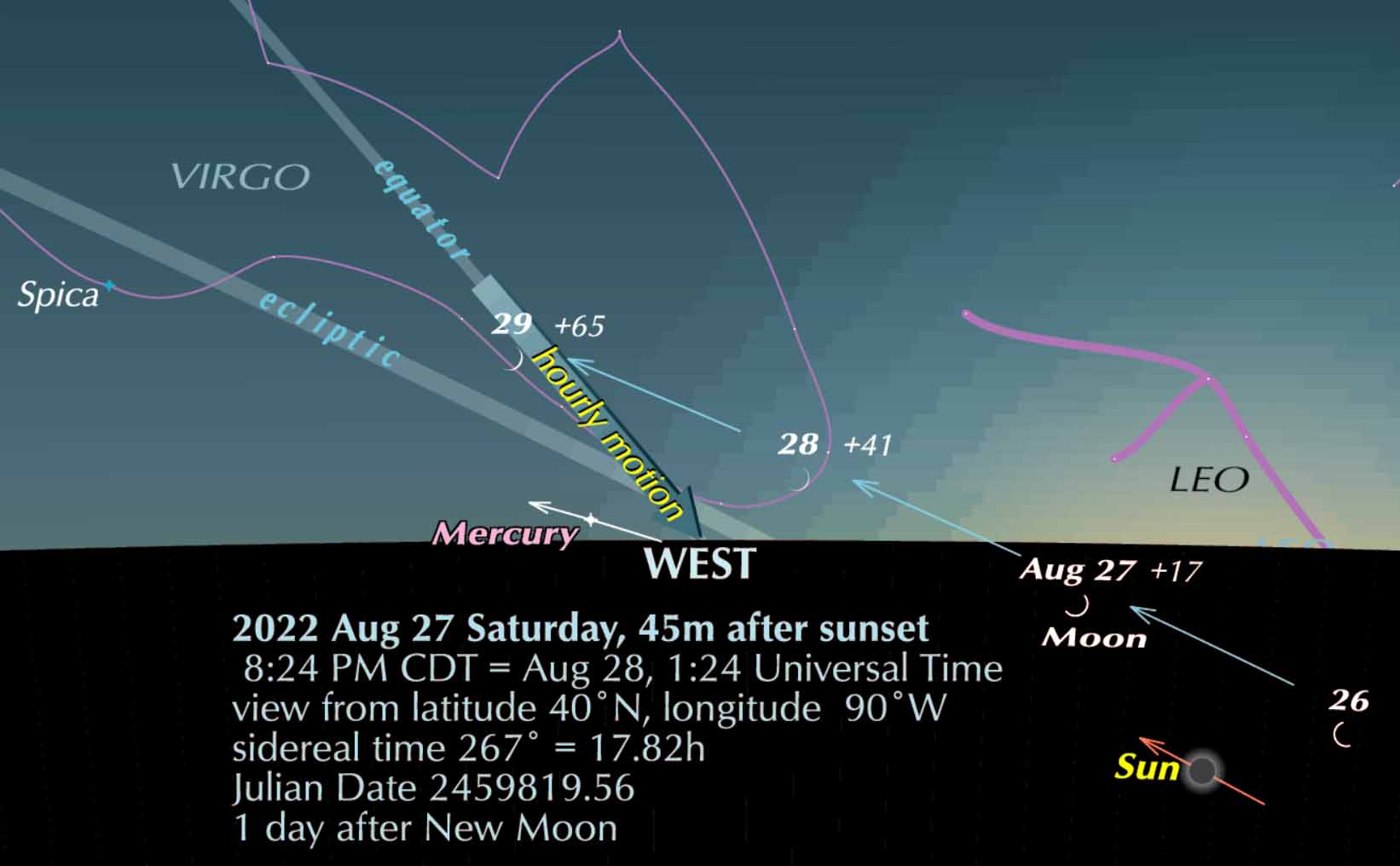 The Moon was new (passing the Sun) a few hours earlier today. The figures beside its crescent shape are its “age” – the number of hours past the new Moon moment. Thus if you managed to glimpse it at this time tomorrow (from this location) it would be only 41 hours old – exquisitely slender, yet it has been seen when only 15 hours old.