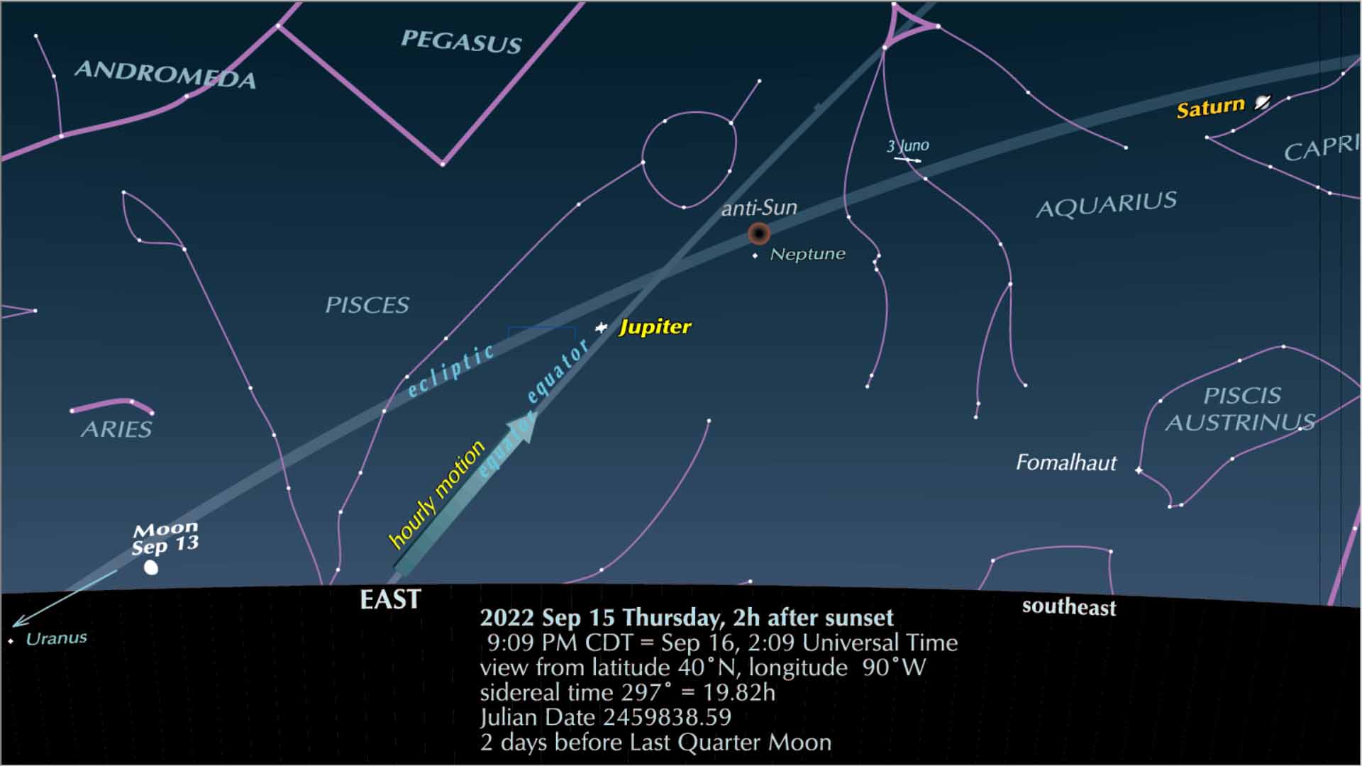 You can see that, at the time of our picture, the planet is about to be overtaken by the “anti-Sun,” the point 180° from the Sun. Nearby, distributed along the ecliptic, are Saturn, the asteroid Juno, and Jupiter, whose opposition dates are Aug. 14, Sep. 7, and Sep. 26.