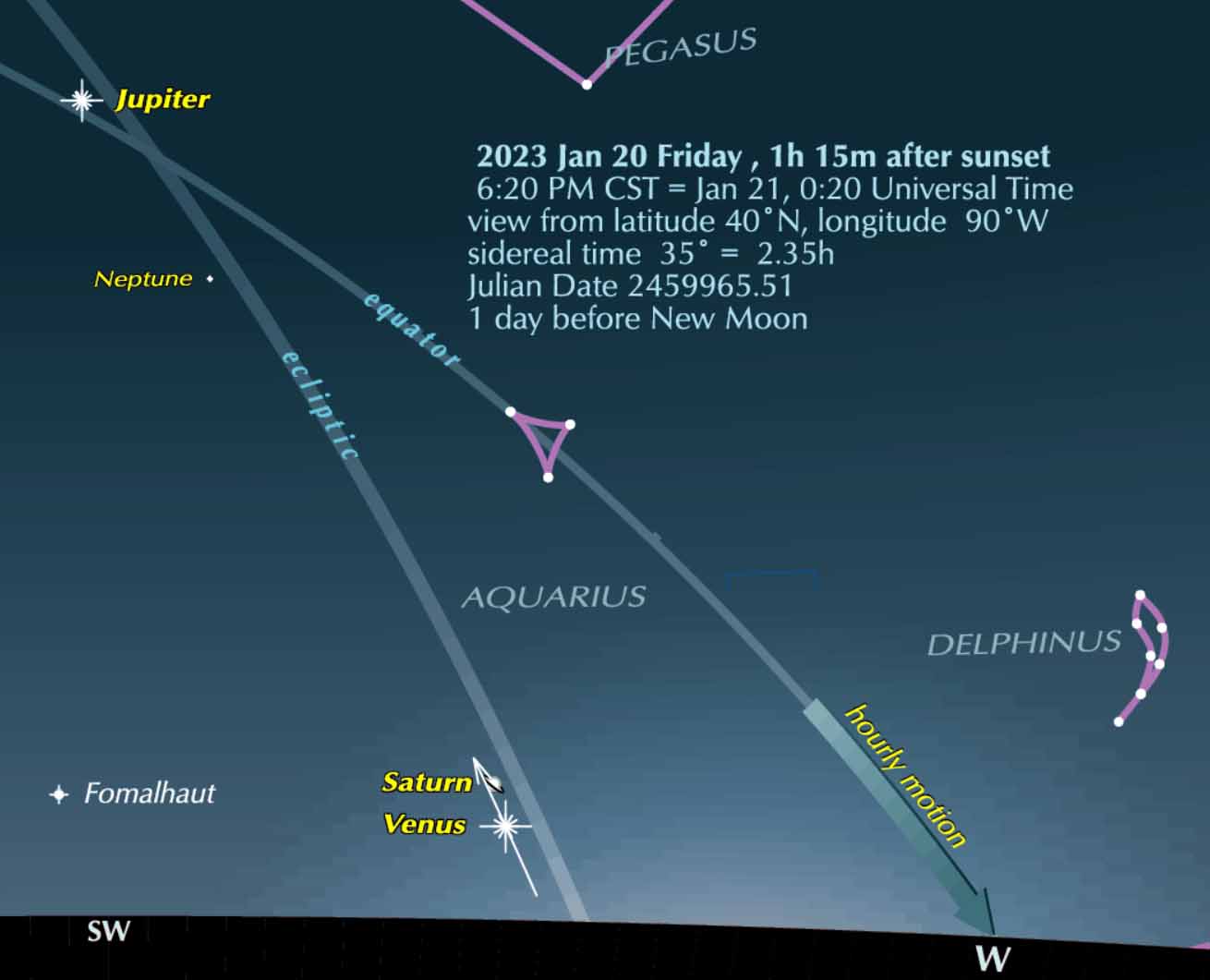 Jupiter is in Pisces, having recently passed the vernal equinox point (where ecliptic and celestial equator intersect) and moved across the equator into the north celestial hemisphere (on Jan. 13); and, at the time and location of our picture, is 41° above the horizon.