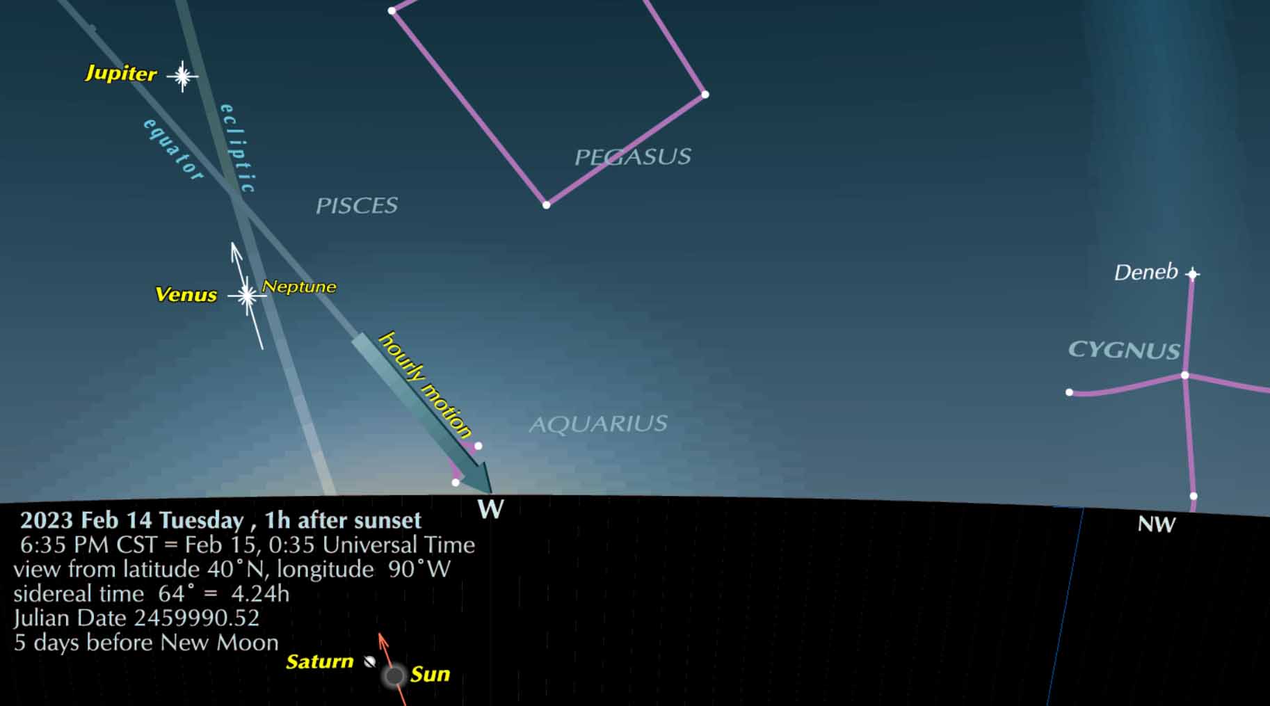She will pass very close south of her uncle Neptune on February 15, and you just might be able with binoculars to pick him out in Venus’s dazzle. Their magnitudes are -4.0 and 8.0 in the logarithmic scale used in astronomy, meaning that Venus is about 63,000 times brighter.