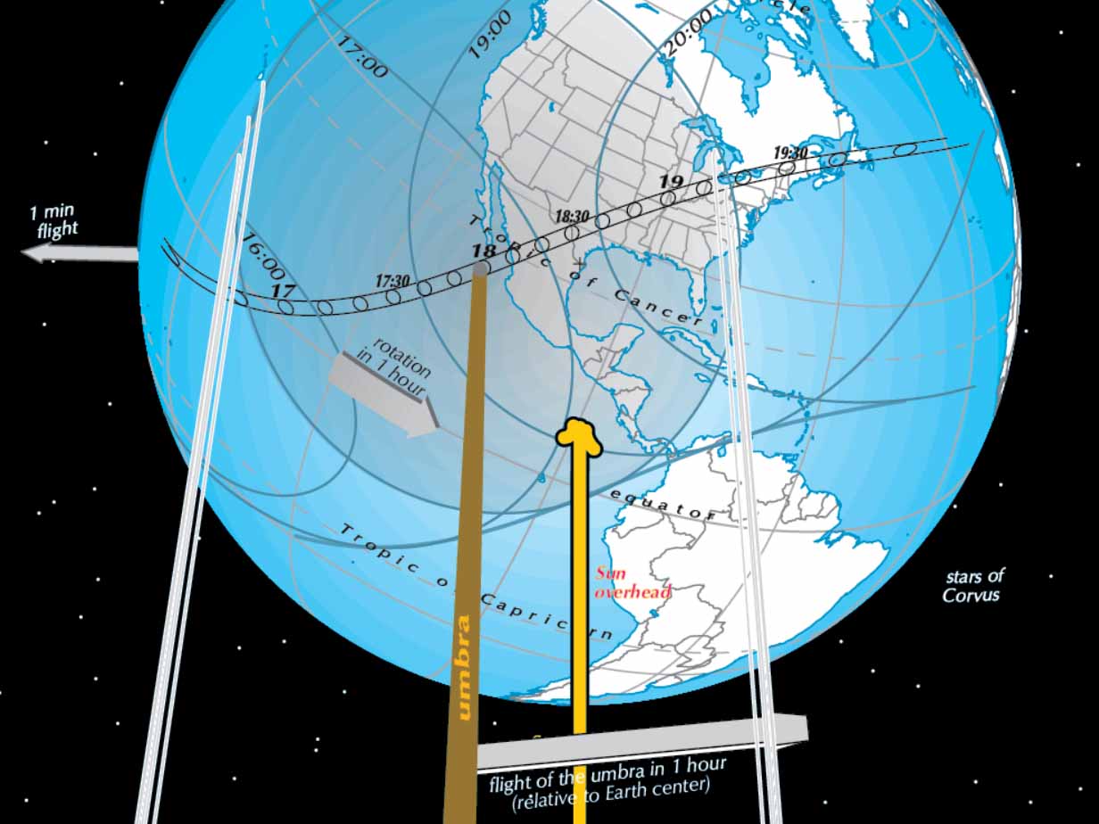 with the cone of the total shadow, and the path it will trace from Texas to Newfoundland.