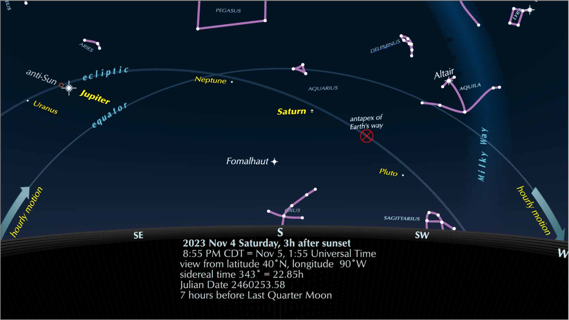 The point we mark as the “anti-Sun” is the direction opposite to (180° from) the Sun, and Jupiter is near it, having been at opposition on Nov. 3. About 90° from it is the “antapex of Earth’s way,” the direction away from which we are traveling at this moment in our orbit around the Sun.