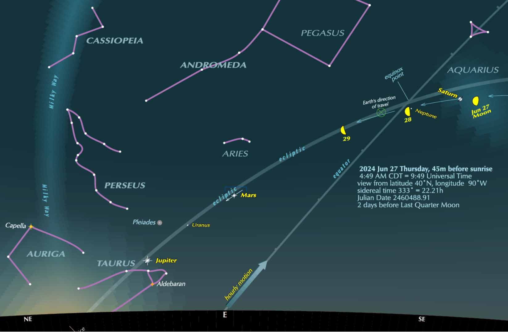 See the end note about enlarging illustrations. Arrows through the moving bodies show their movement (against the starry background) from 2 days earlier to 2 days later. Moon and Sun are exaggerated 4 and 2 times in size. Saturn is exaggerated 150 times in size, to show the current attitude of its rings. There will be little difference a day later, except in the position of the Moon.
