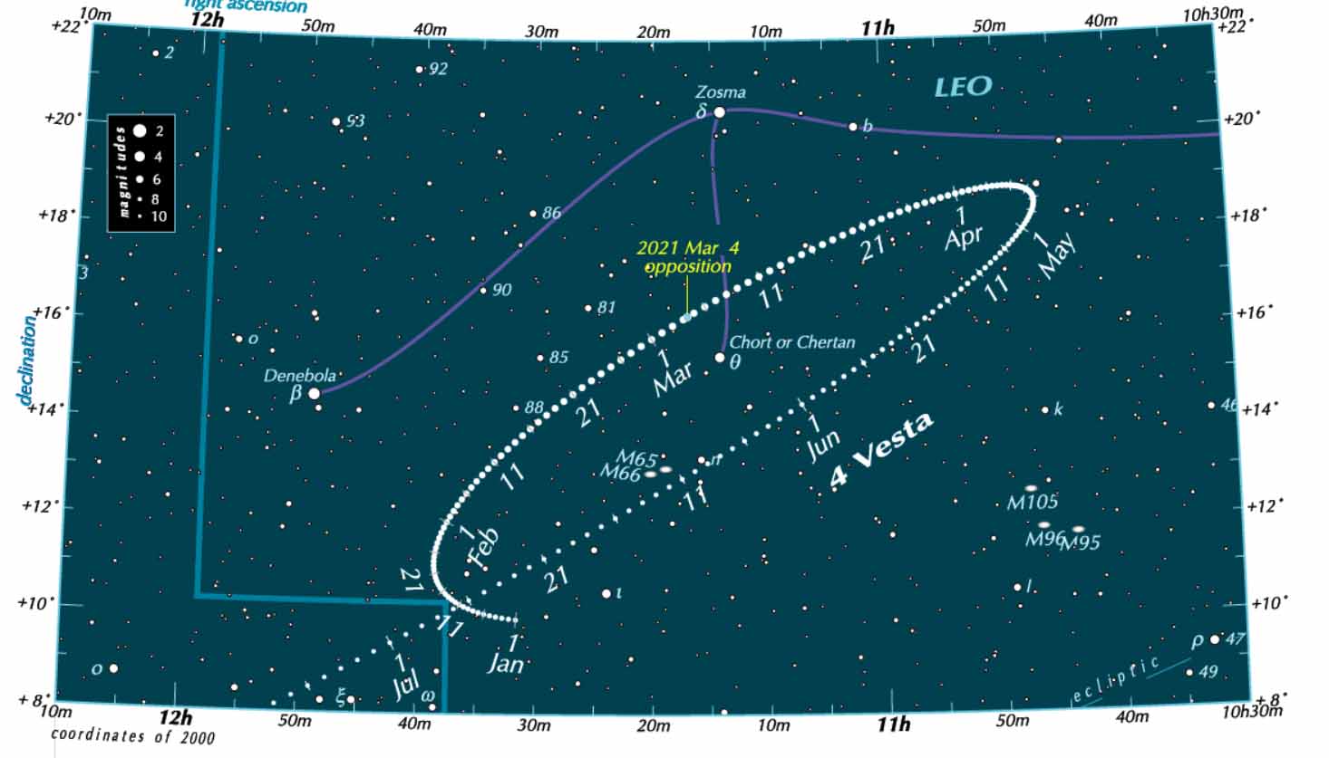 Everyone’s favorite asteroid, Vesta, is taking its apparent retrograde path, across the hind leg of Leo the lion, as we pass nearest to it.